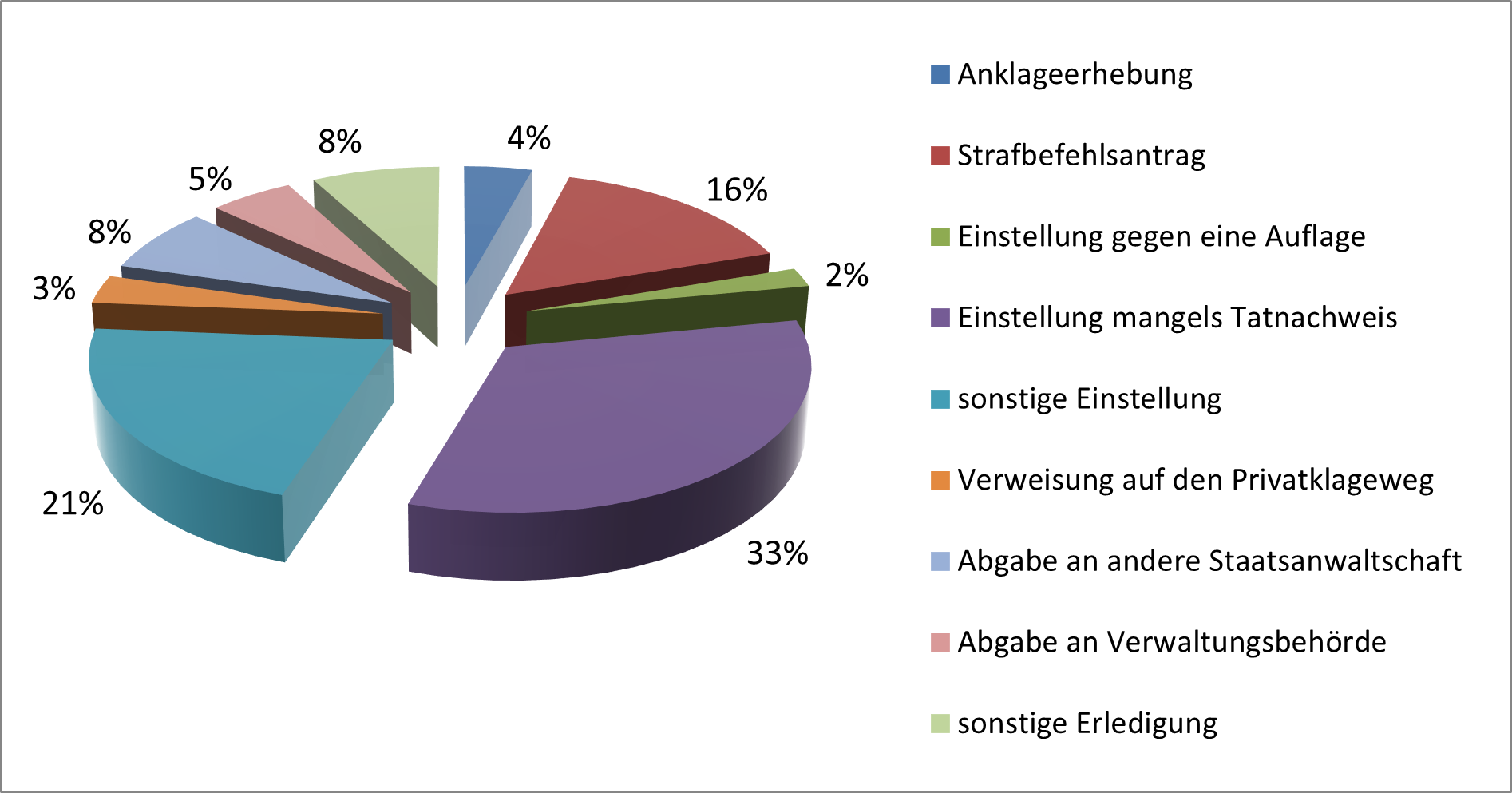 Im selben Zeitraum wurden 41 069 Verfahren gegen 46 716 bekannte Beschuldigte erledigt und zwar - bezogen auf die Anzahl der Beschuldigten - durch: